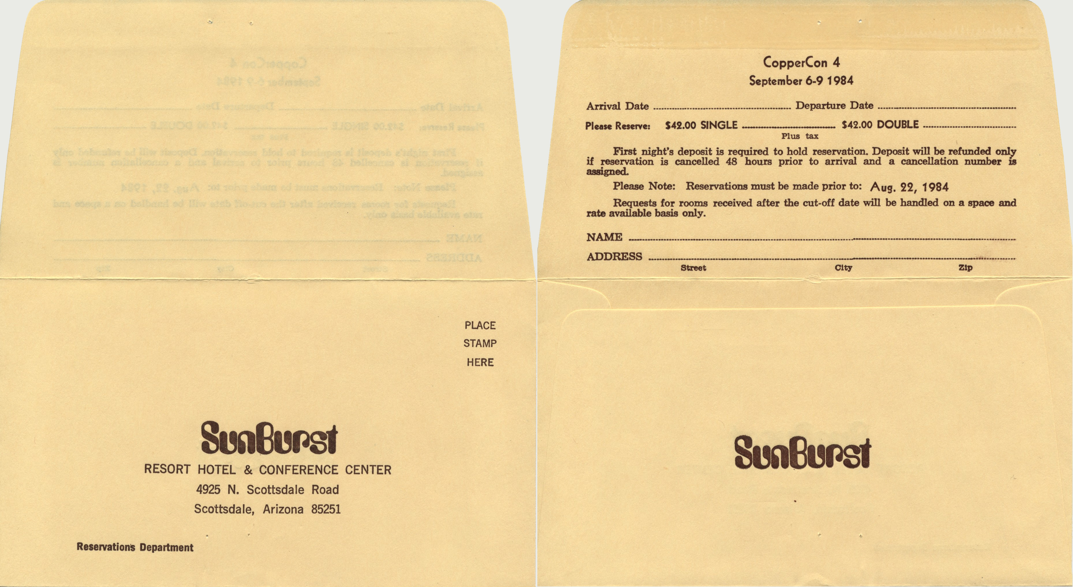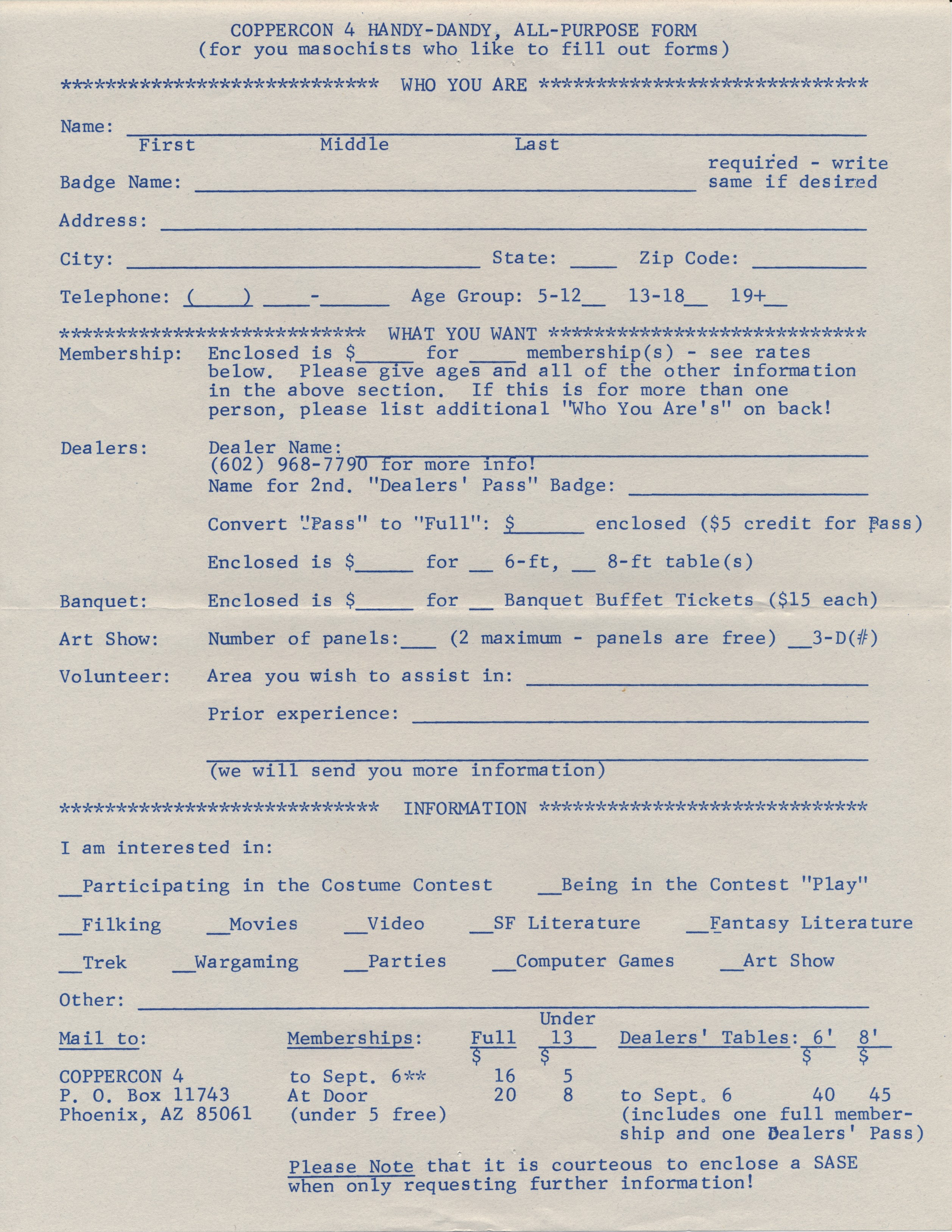 CopperCon was an annual science fiction convention with a special focus on literature. It was run by CASFS (the Central Arizona Speculative Fiction Society) and was held from 1981 to 2014. In 2018, it was revived as half of CoKoCon, a joint effort by CASFS and WesternSFA. The name reflects that its heritage is in a CopperCon and a ConKopelli. Most Recent Program Book Covers | History | Notes | High Quality Cover Scans | Other Documents | Program Book Covers |