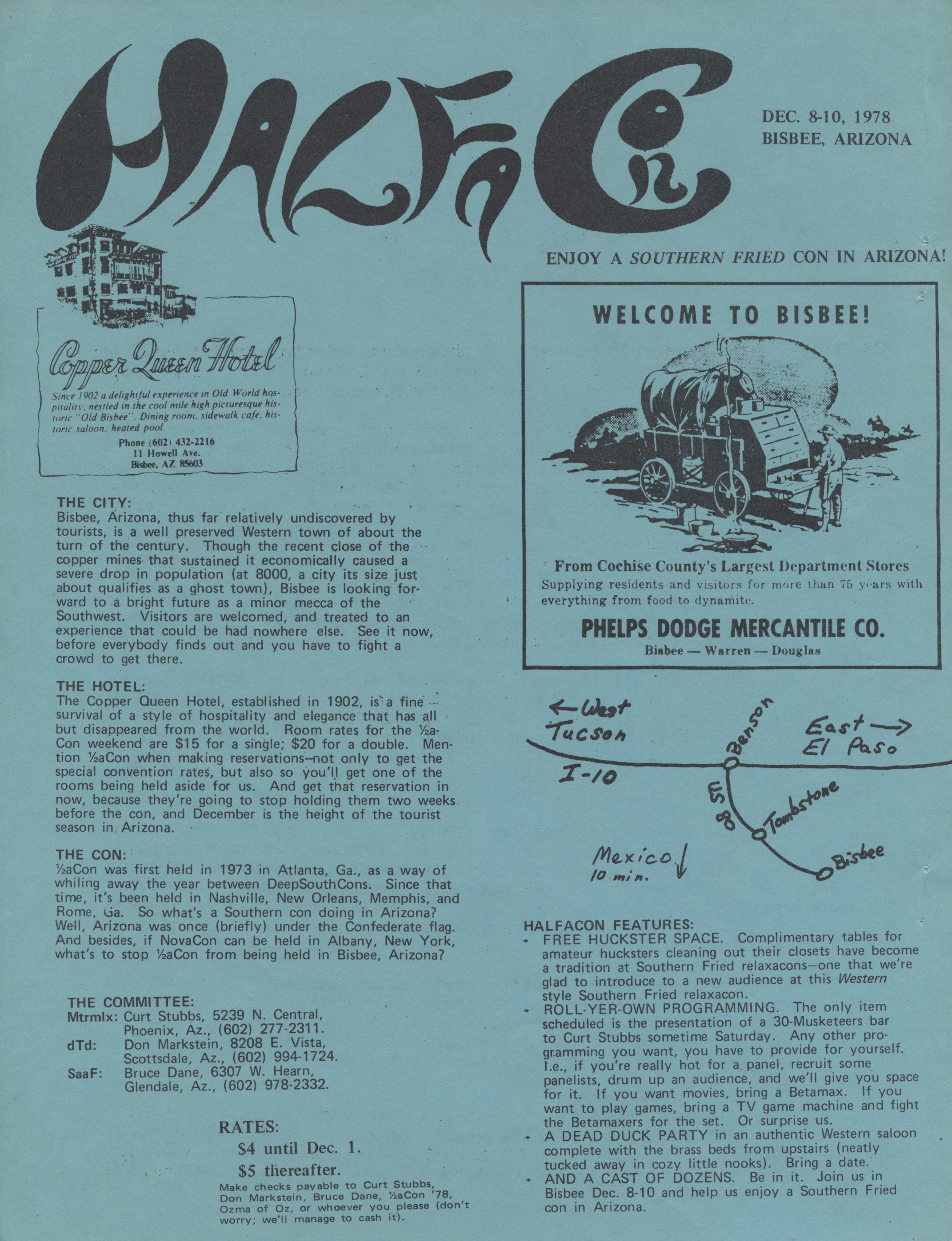 HalfaCon was a regional convention that began in 1973 to offer fans in the south a second convention halfway between their regular travelling convention, DeepSouthCon, which was first held in 1963 at Dave Hulan's house in Huntsville, Alabama but grew into a far more substantial event. It was held at least six times, the first instance in Atlanta, Georgia in 1973 and later in Louisiana, Alabama and Kentucky. Arizona seems like an odd state out here, but chair Don Markstein looked at hosting it when he lived in Texas. As HalfaCon had a unique bidding process where the first person to mount a credie bid wins it unopposed, he floated the idea among Phoenix fandom after he moved to Scottsdale and they ended up winning it for Bisbee in December, partly because Curt Stubbs's thirtieth birthday fell on the Saturday; presenting him with a "30 Musketeers" bar was the only programming item. The attendance was very small ("19 eventually showed up, not counting three under 5") because Bisbee was hit by a serious snowstorm that weekend. Those who did make it included Don Markstein, Curt and Mahala Stubbs, B. D. Arthurs and M. R. Hildebrand, Sandy Kahn, Mark Christiansen and probably Bruce Dane. |