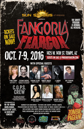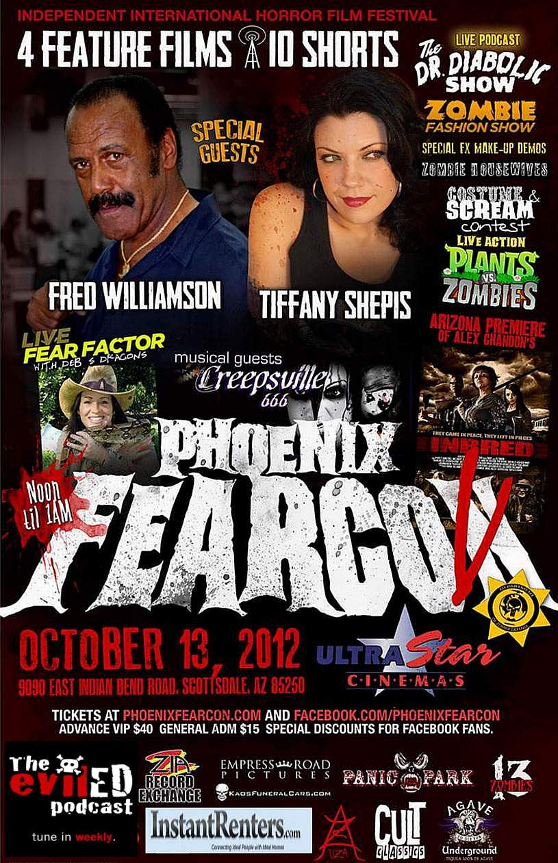 Phoenix FearCon sometimes has too many guests to list in the table above. Here are the guests announced for each event (in alphabetical order): 2006: Syn Devil. 2008: Brain Damage Films, Count Smokula, Eben McGarr and R. A. Mihailoff. 2010: Brain Damage Films, Fancy Pants, Nick Principe, Tiffany Shepis and Thunder Stump. 2011: Charles Band, Tiffany Shepis and Voltaire. 2012: Creepsville 666, Tiffany Shepis and Fred Williamson. 2014: John Brightman, Theodus Crane, Ken Foree, Kyla Kenedy, Oliver Robins, Tiffany Shepis, Scott Tepperman and Mark Torgl. 2016: Eugene Clark, John Dugan, Lynn Lowry, Robert Mukes, Monique Parent, Tiffany Shepis, Ari Stidham, Lew Temple, Jay & Marie Yates. 2019: Agents of Lust, Ken Foree, Lynn Lowry, Spider Hole, Voltaire and Fred Williamson. 2021: Craig Chenery and Fred Williamson. 2022: Voltaire. |